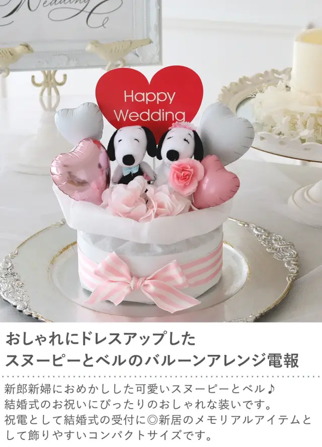 おしゃれにドレスアップしたスヌーピーとベルのバルーンアレンジ電報