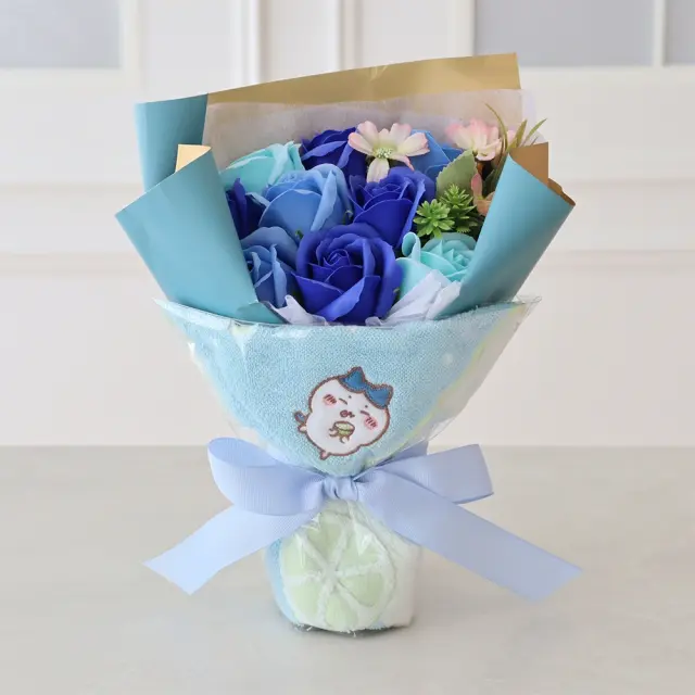 華やかでいい香りのするソープフラワーにちいかわのタオルで可愛らしいブーケに仕上げました。