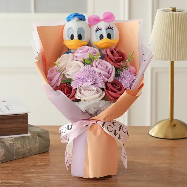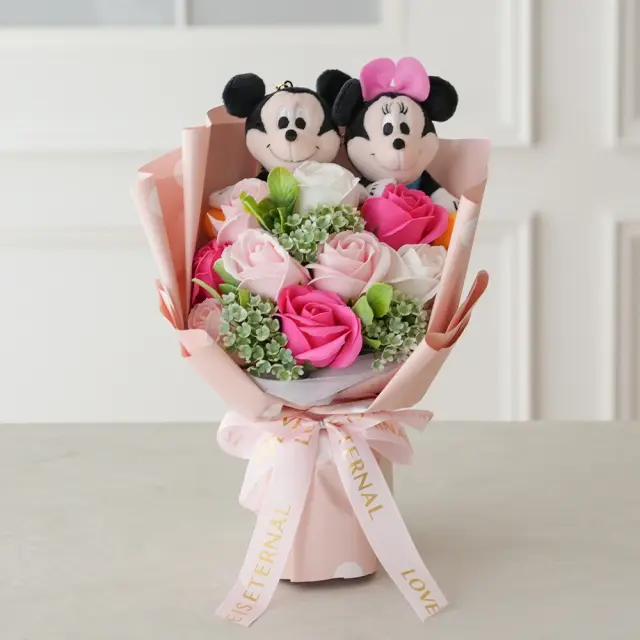 お花とぬいぐるみの仲良く寄り添うディズニーキャラクターのニコぬいと、