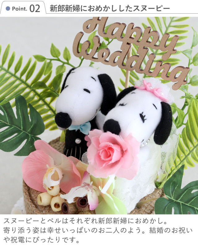 スヌーピーとベルはそれぞれ新郎新婦におめかし。寄り添う姿は幸せいっぱいのお二人のよう。