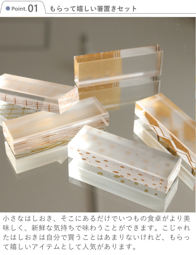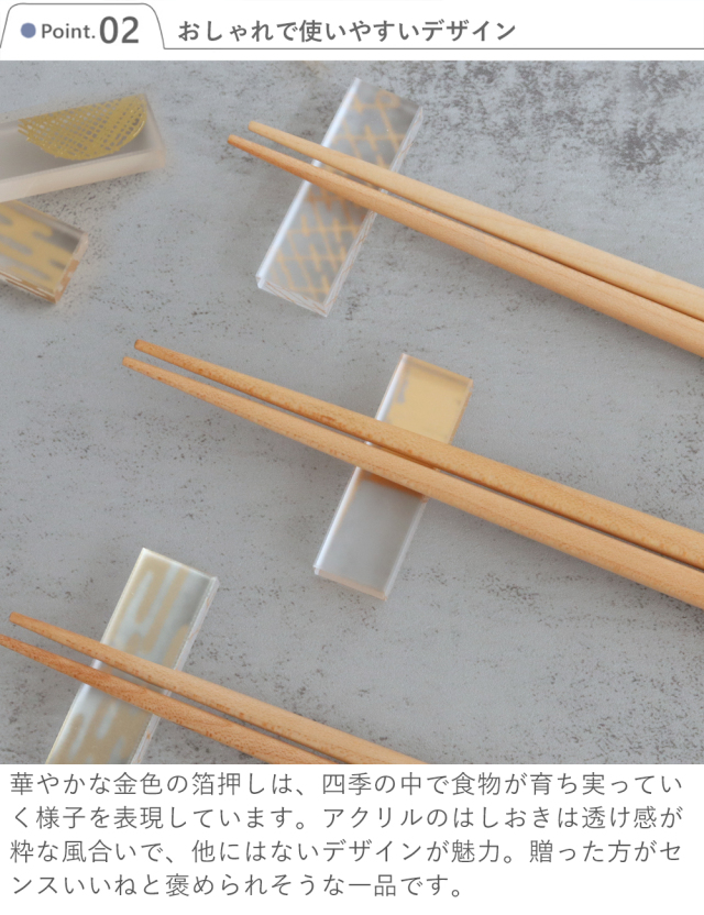 アクリルのはしおきは透け感が粋な風合いで、他にはないデザインが魅力。