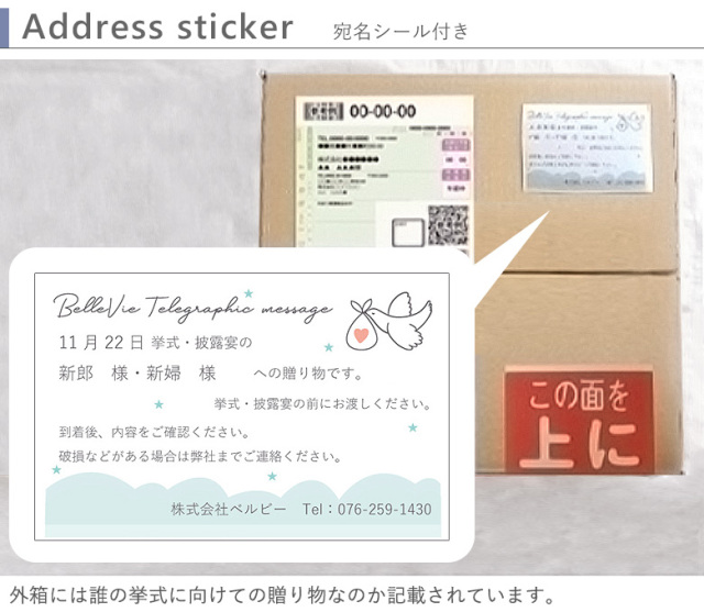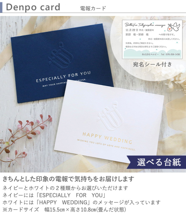 TOP バルーン電報 電報カードセット ※単品購入不可※ 価格: ¥700 (税込) [ポイント還元 7ポイント~] 販売期間: 電報デザインをお選びください: 選択してください ギフト電報ネイビー(ESPECIALLYFORYOU) ギフト電報ホワイト(HAPPYWEDDING) 電報作成について: 選択してください A.自分でデータを作る B.ショップに依頼する(備考欄に記載) 挙式日時: 自由文記入欄: 数量: セット 在庫: 9,912セット 在庫 9,912セット 返品についての詳細はこちら ※こちらの商品は、他商品と 同時購入の方のみご注文可能です。予めご了承くださいませ。 ※電報(メッセージカード)はご注文頂いたあとすぐ製作に入ります。 メッセージの変更はできません。あらかじめご了承ください。 ※この商品は「電報(カード)」のみのセットとなります。 他商品と組み合わせたい場合は、他商品を別途お求め下さい。 ◆商品内容 電報、宛名シール ◆サイズ 電報SIZE:W150×H108mm(畳んだ状態) ◆その他 ※全ての商品と同梱可能です ※土・日・祝日の発送業務はお休みです。