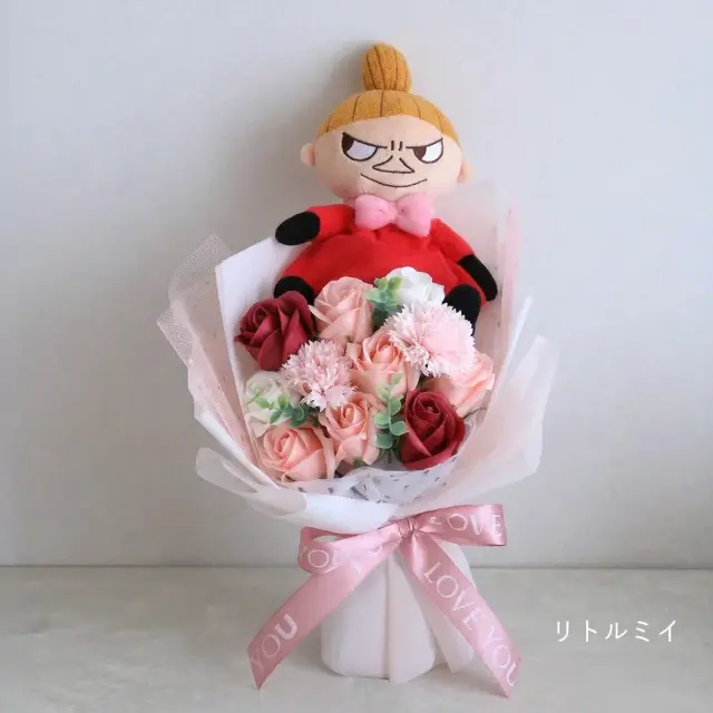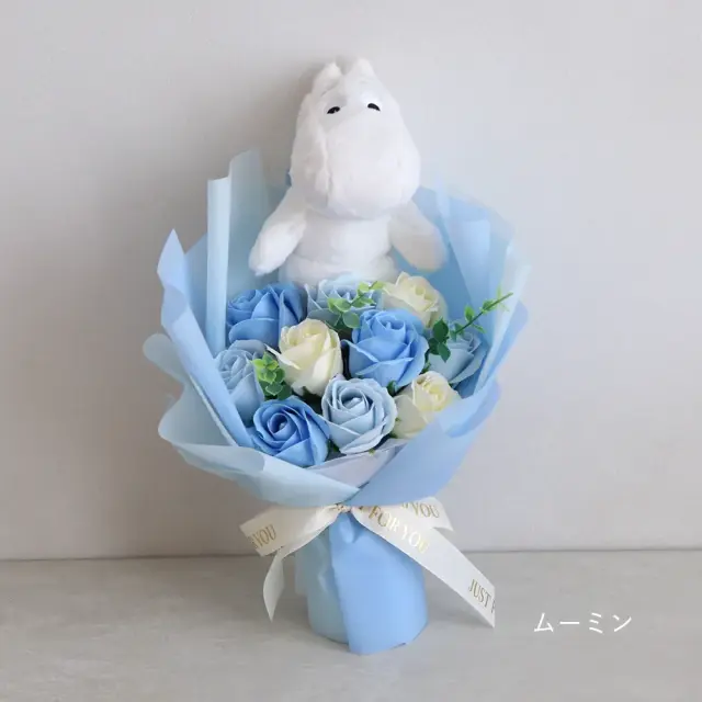 華やかなソープフラワーブーケに、ムーミンorミイのぬいぐるみエコバッグを添えたギフトです。